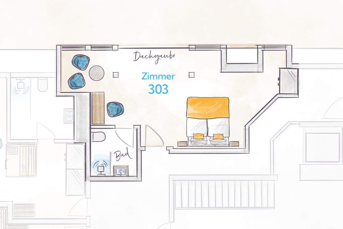 Unsere Standard-Zimmer sind darauf ausgelegt, dir einen entspannten Rückzugsort zu bieten. Ein komfortables Boxspringbett (180x200cm) lädt zum Ausschlafen ein, während das moderne Duschbad dir morgens Energie schenkt. Vom Fenster aus siehst du die Weinbergkapelle – ein kleiner Gruß aus der Schlierseer Landschaft. Gönn dir hier eine Auszeit vom Alltag und genieße die wohlige Atmosphäre.